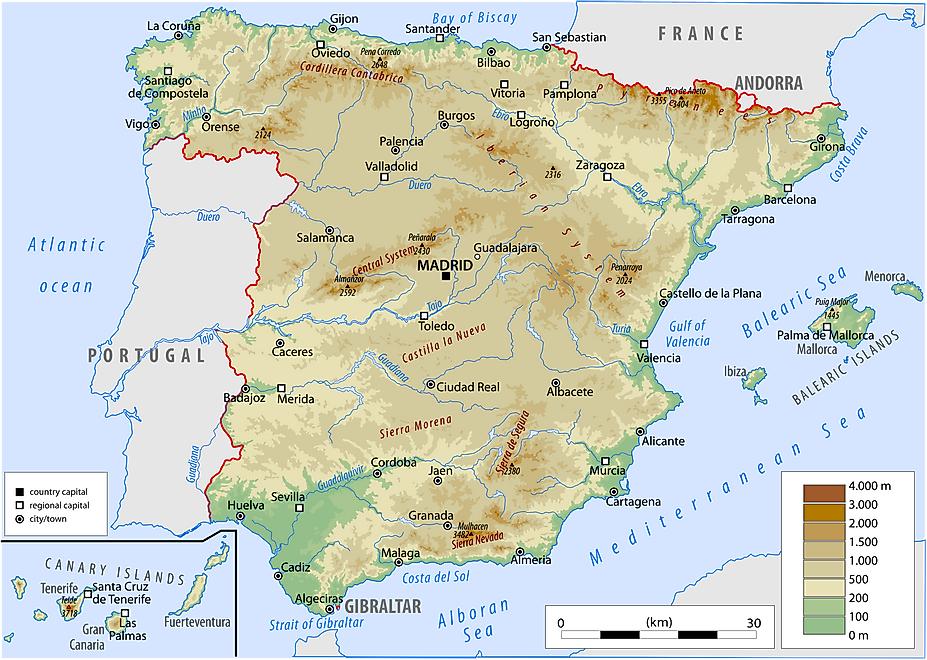 Les régions d'Espagne peuvent être divisées en cinq régions différentes, comme vous pouvez le voir sur la carte physique de l'Espagne. Ces cinq régions sont l'Espagne verte, l'Espagne intérieure, les Pyrénées, l'Espagne méridionale et l'Espagne méditerranéenne. L'Espagne verte est située dans le nord et le nord-ouest de l'Espagne. L'Espagne intérieure possède de nombreux plateaux, mais aussi un plateau spécial, un plateau géant, appelé La Meseta. Les Pyrénées ont des rivières, des lacs glaciaires et de petites plaines. Le sud de l'Espagne est bien sûr situé au fond ou dans la partie sud de l'Espagne. Le climat du sud de l'Espagne varie car il y a un endroit très enneigé dans le sud de l'Espagne, mais il y a aussi un désert. Le sud de l'Espagne va de la frontière sud-est à la frontière sud-ouest. L'Espagne méditerranéenne a les villes de Valence, la Catalogne, et Murcia dans le côté de la région qui bordent la mer Méditerranée. En Espagne méditerranéenne est une partie très tropicale de l'Espagne et a peu d'îles.