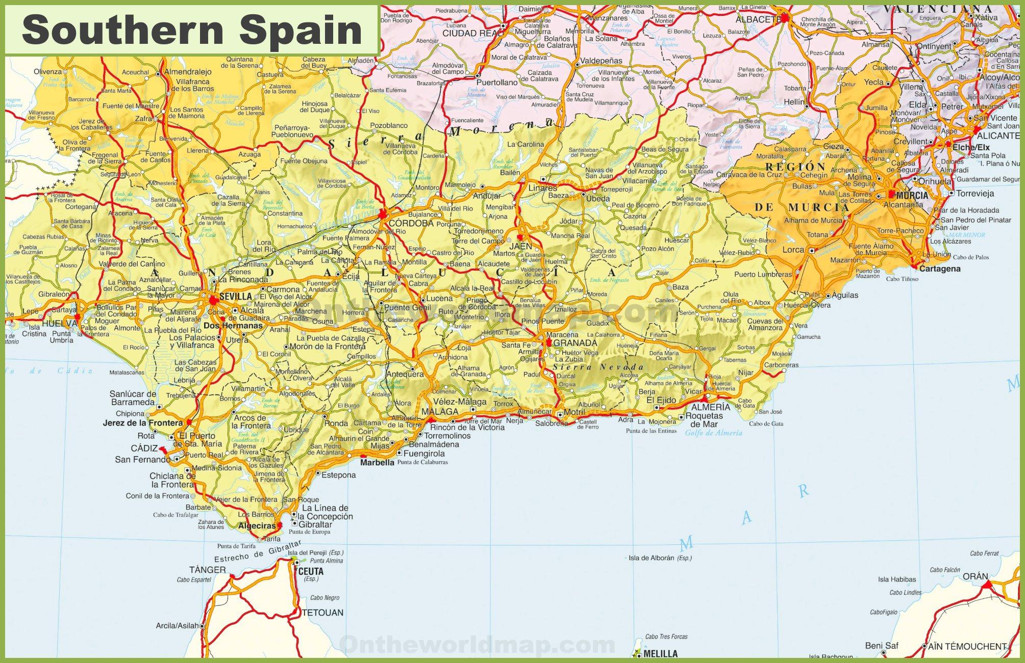 Carte détaillée du sud de l'Espagne. Carte du sud de l'Espagne (Europe du Sud - Europe) à imprimer. Carte du sud de l'Espagne (Europe du Sud - Europe) à télécharger. L'Andalousie est une communauté autonome qui couvre la majeure partie du sud de l'Espagne. Elle possède un paysage diversifié, avec un long littoral méditerranéen et sa propre chaîne de montagnes, et est connue pour avoir les températures moyennes les plus chaudes d'Europe. L'Andalousie, telle qu'elle est représentée sur la carte du sud de l'Espagne, est une traduction approximative d'un mot arabe signifiant "vandales", car elle a été attaquée et revendiquée par de nombreuses cultures et nations différentes en raison de son emplacement privilégié. Cela a créé une série de villes et de villages à l'architecture, à la cuisine et à l'histoire très multiculturelles. Elles abritent une culture de la fête, pleine de festivals, de danse flamenco, de tapas et de sherry