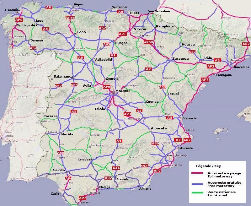 Carte de l'Espagne de l'autoroute. L'espagne de l'autoroute de la carte (le Sud de l'Europe - Europe) à imprimer. L'espagne de l'autoroute de la carte (le Sud de l'Europe - Europe) à télécharger. Les autoroutes radiales divisent l'Espagne en six zones, chacune d'entre elles portant le numéro de la route qui la délimite sur la gauche, en partant du centre vers l'extérieur, comme le montre la carte des autoroutes espagnoles. Chaque route commençant dans une zone particulière reçoit un numéro commençant par le chiffre de cette zone et conserve ce numéro sur toute sa longueur, quelle que soit la zone dans laquelle elle se termine. Les routes N à double chaussée ayant des caractéristiques d'autoroute ont parfois des numéros de sortie déterminés par les kilomètres.