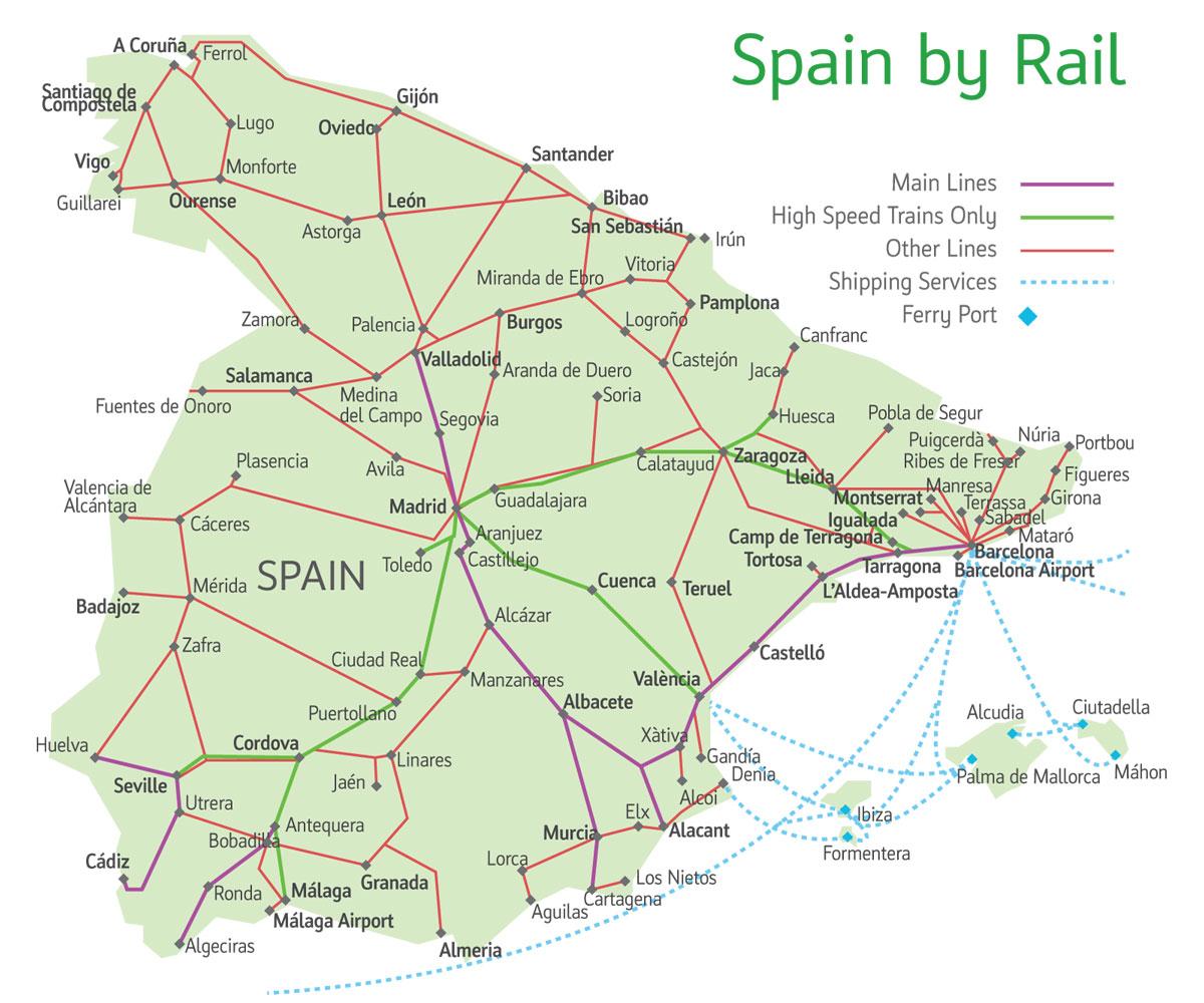 Les principaux fournisseurs de trains en Espagne sont Renfe et Renfe AVE, bien que la société se soit également associée à la SNCF (France) pour créer des lignes directes vers la France. Renfe, comme vous pouvez le voir sur la carte des trains d'Espagne, propose des trains destinés aux itinéraires ruraux régionaux, aux itinéraires de banlieue et aux itinéraires longue distance à grande vitesse. En Espagne, certaines des lignes intérieures les plus populaires vont de Madrid à Barcelone, de Barcelone à Valence, de Madrid à Séville, de Séville à Cordoue, d'Alicante à Madrid et de Saragosse à Barcelone. Il existe également quelques lignes internationales populaires, notamment Madrid-Lisbonne, Barcelone-Montpellier et Madrid-Paris